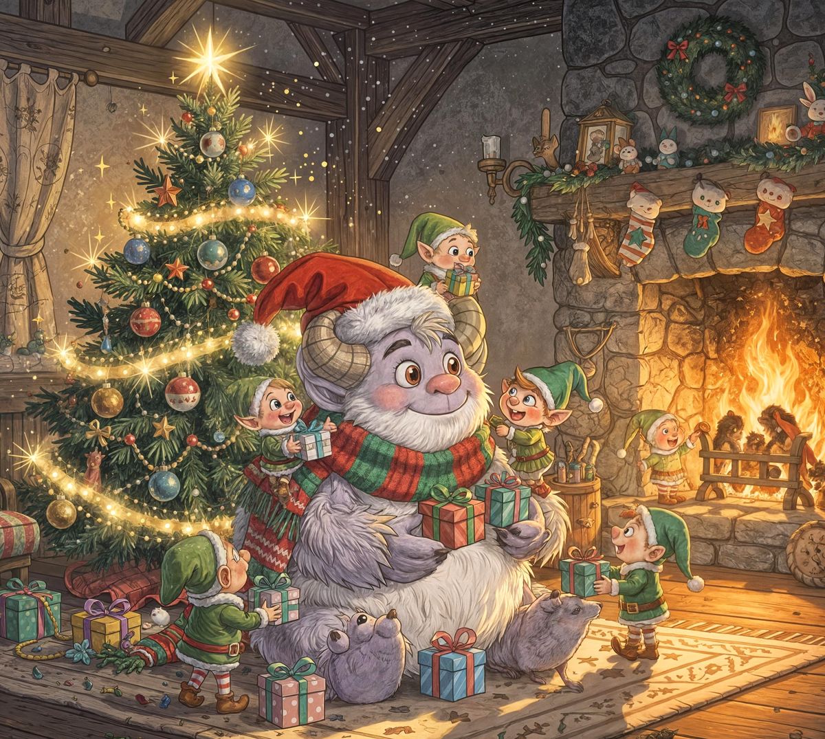 A friendly, fluffy monster adorned with a Santa hat and a festive scarf, sitting by a twinkling Christmas tree. Elves are wrapping presents around the monster playfully. The scene is illuminated by the warm glow of fairy lights and a crackling fireplace, casting playful shadows. Rendered in a whimsical, ...