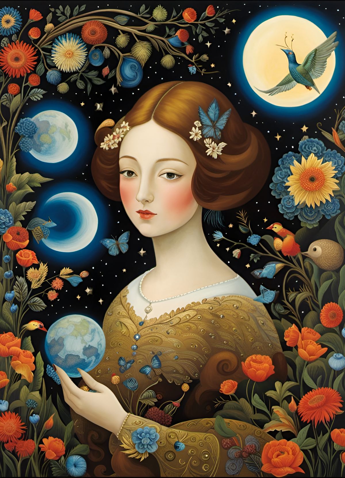 3d stumpwork;ghost haunts room by artist "Agnolo Bronzino";by artist "Hector Guimard";by artist "Hieronymus Bosch";by artist "tromp l'oeil";by artist "tessellated fractal cloisonnΓ©";hyperdetailed matte night sky background;stars,lens flare,moonrays;sharp focus;octane render