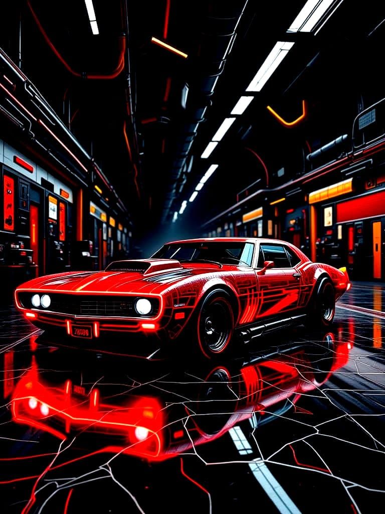 Easily design futuristic cybernetic vehicles like the Cyber-Camaro with our free AI image generator. Start creating now!