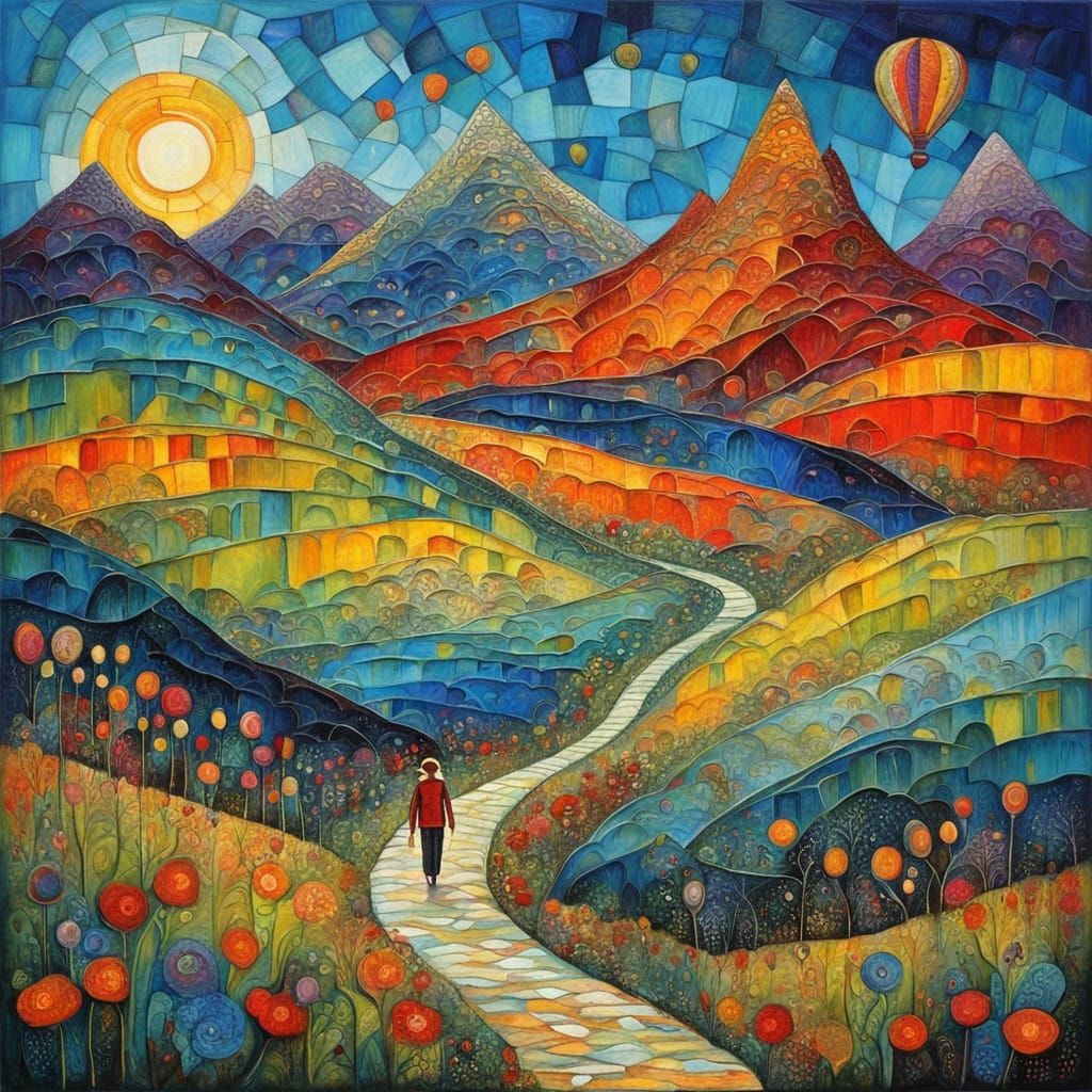 This image features a lone hiker on a mountain trail rendered as an encaustic painting. It showcases a textured, naive art style with sweeping brushstrokes and vivid colors, creating a dreamlike panorama.