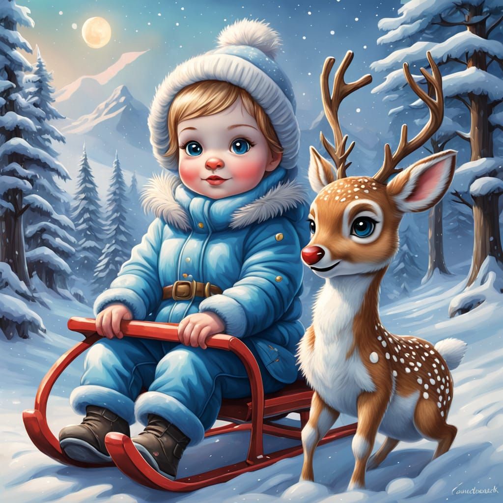 This image shows a cartoon baby with sparkling blue eyes sitting on a sled next to a fawn. The style is reminiscent of colored pencil art, with a soft, warm lighting.