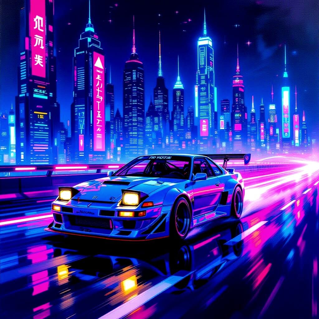 This image shows a Toyota racing down a neon-lit highway. The artwork features intricate mechanical details and synthwave colors reminiscent of retro-futuristic landscapes in an oil on canvas style.