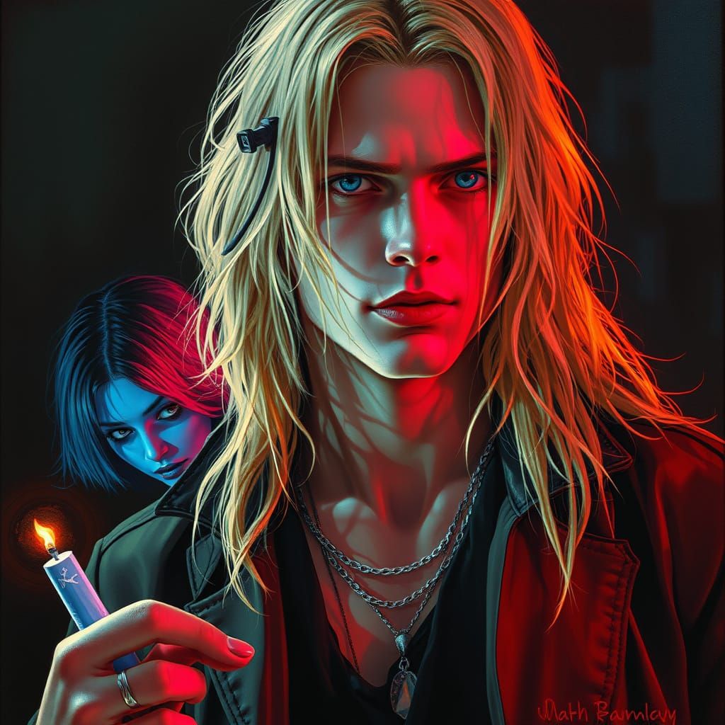 This image shows a vampire with long blond curls and bloody fangs, wearing baroque clothing. The portrait features dramatic lighting and rich, complementary colors, creating a dark, romantic aesthetic reminiscent of 80s concept art.