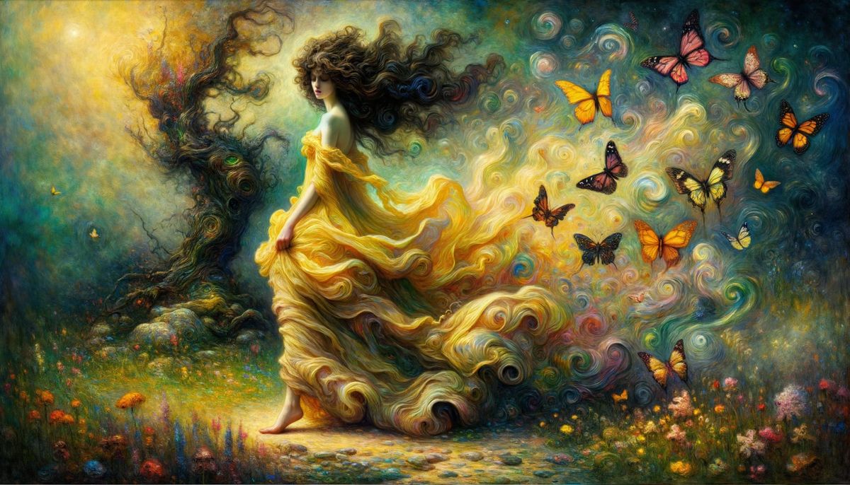 This image depicts a woman in a yellow gown with flowing black hair, surrounded by colorful butterflies. The scene blends realism with impressionistic and symbolic art styles, evoking nature's essence.