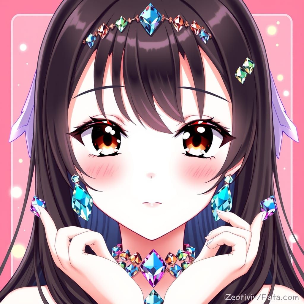 This image is a stylized portrait of a young girl, inspired by Japanese anime art, featuring long black hair, brown eyes, and intricate multi-colored crystal jewelry.