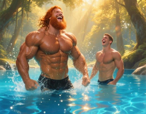 This image shows two athletic friends enjoying a sun-drenched forest swimming hole. Captured in a cinematic style with vibrant lighting, it evokes summer freedom and joy.