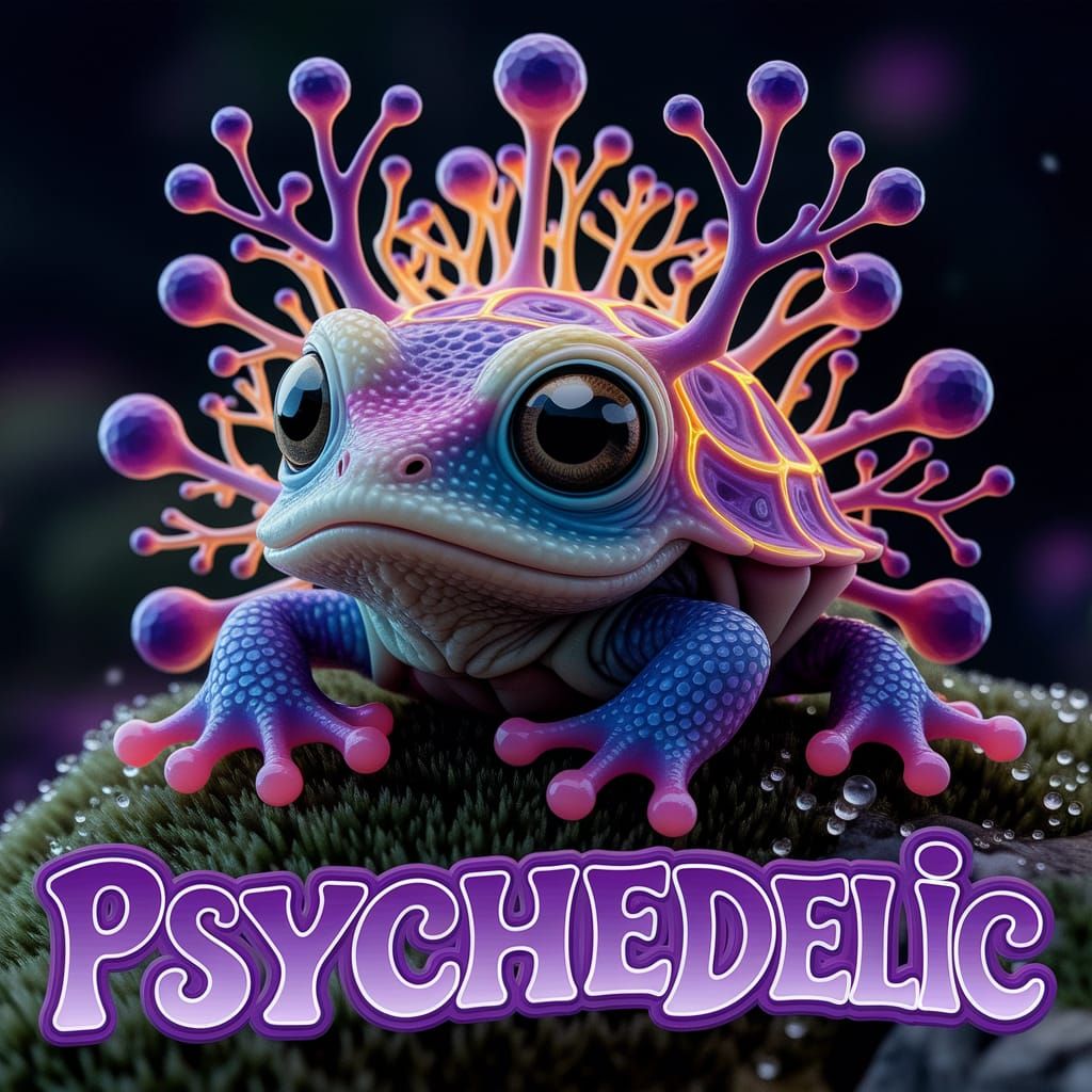 This image shows a mystical creature with a glowing, iridescent shell and big expressive eyes, set amidst a dewy moss background in a psychedelic, maximalist scene with a 70s-style doodle font and gemstones.