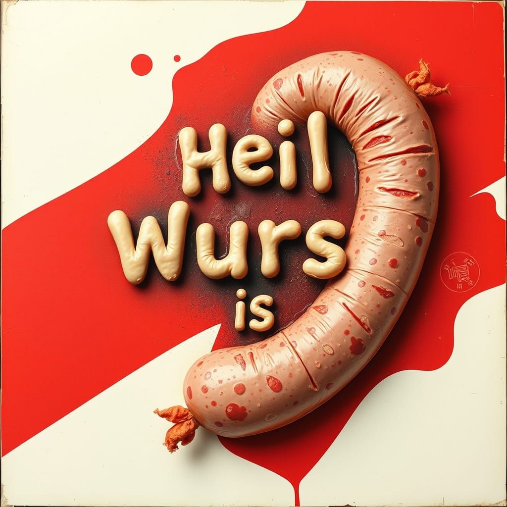 This image depicts a strange and surreal scene featuring sausages in an absurd, Dadaist style. The artwork employs mixed media and a degenerative aesthetic.