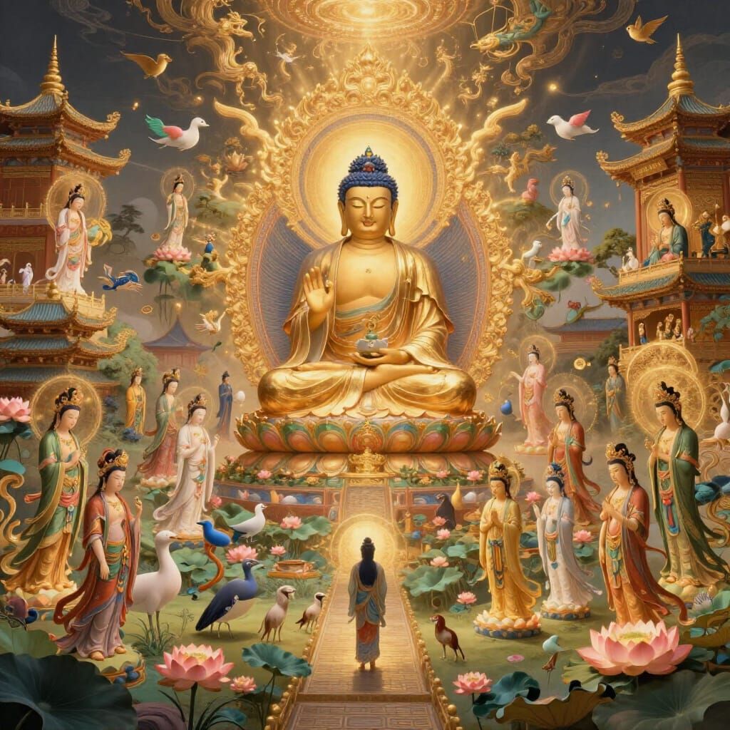 Easily generate detailed images of Amitabha Buddha's Pure Land with our free AI tool. Bring your vision to life now!