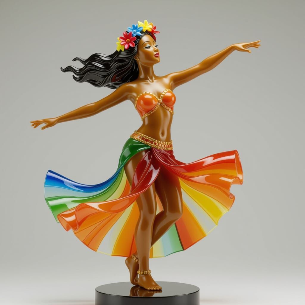 This image captures a multi-colored glass art sculpture of a caramel-skinned hula dancer striking a dynamic pose, evoking a 1928 cinematic film still.