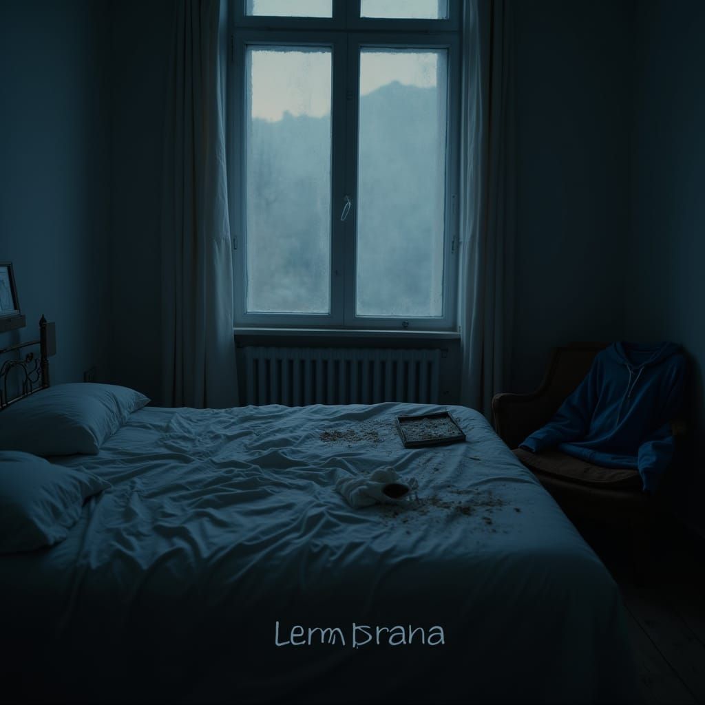 This image shows a melancholic album cover design featuring a lonely bedroom scene at dusk. The design includes faded Portuguese typography and a cold, muted color palette to evoke emotion.