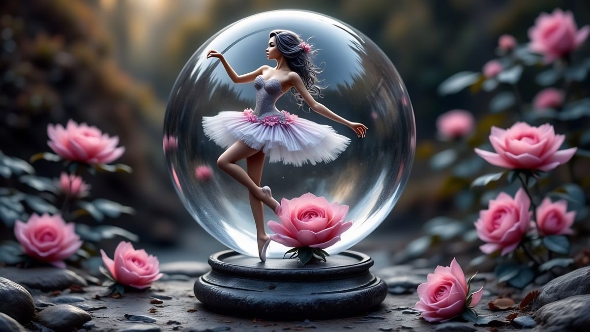 This image features a stunning silver silhouette of a woman in a ballet pose within a glass sphere, holding a pink rose. The scene evokes a sense of delicate beauty and movement.