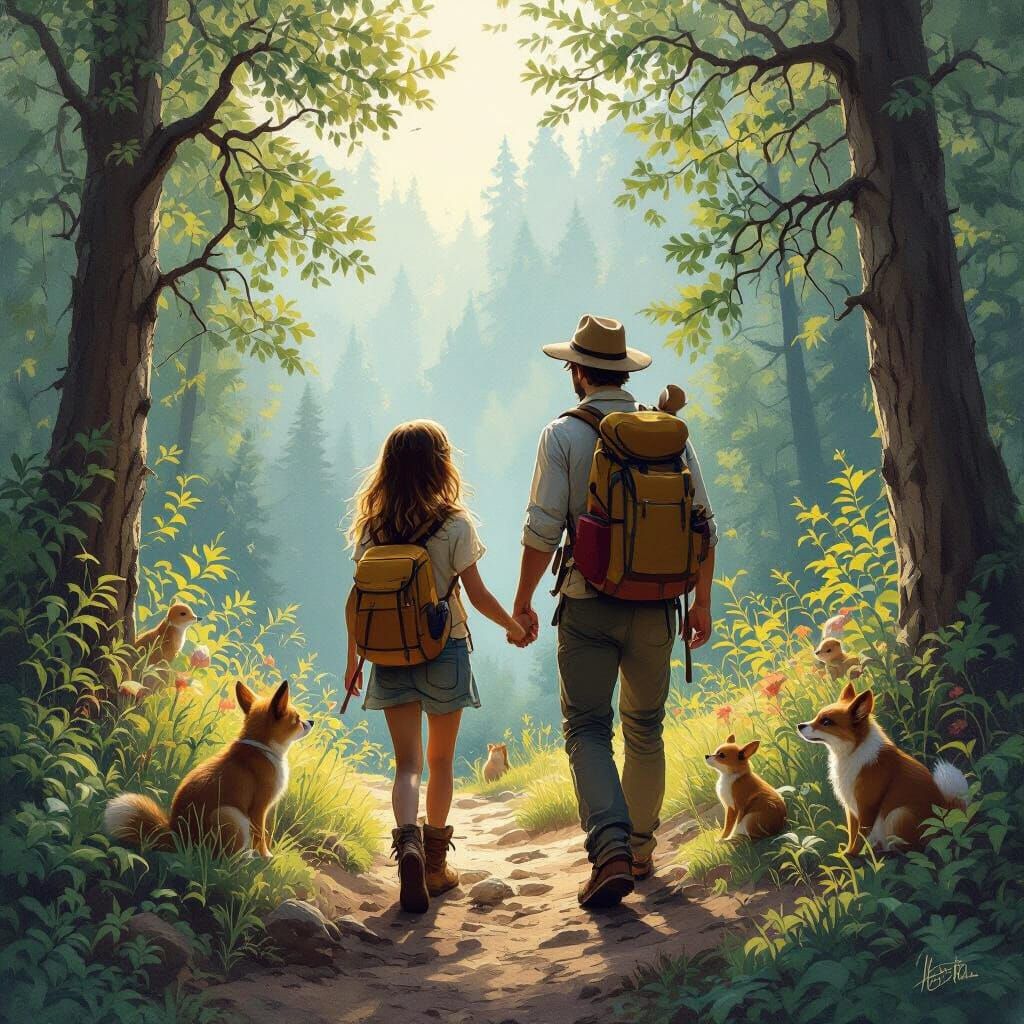 A serene image shows a couple walking through an enchanted forest where animals approach them unafraid. The style evokes wildlife art through detailed realism and a peaceful atmosphere.