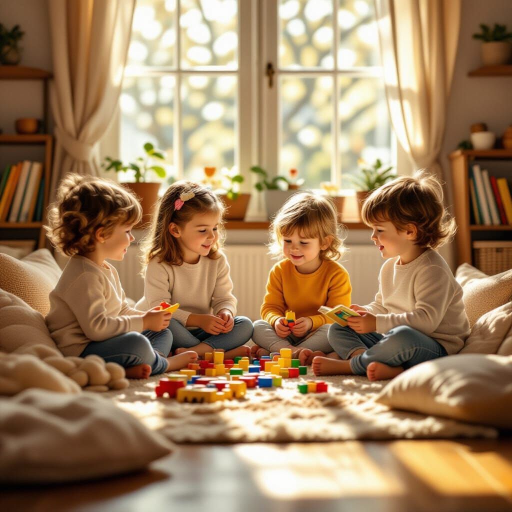 This image shows five children interacting in a warm, sunlit room filled with toys and cushions. Rendered with detailed textures and vibrant colors, it evokes a playful and safe family atmosphere.
