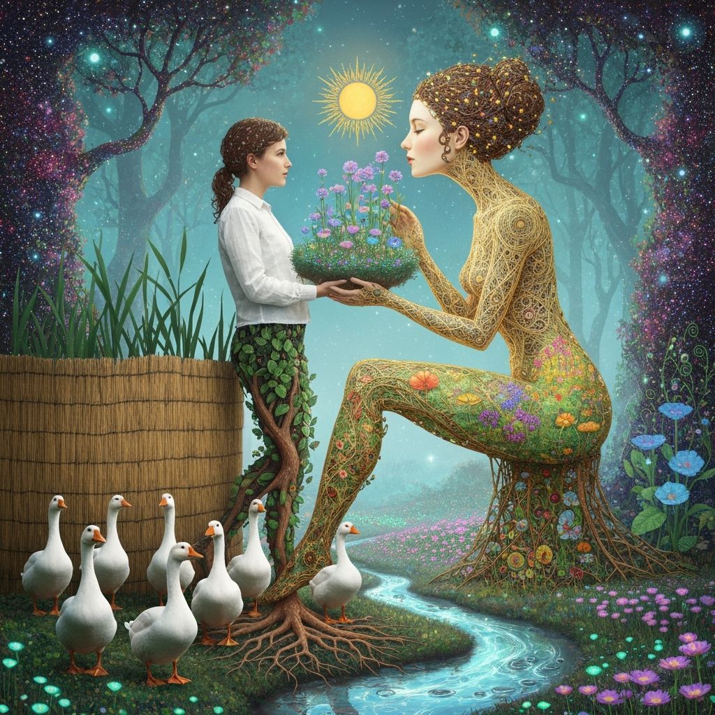A surreal scene features a folkloric robot with stardust hair and her twins in a vibrant, bioluminescent garden. The art style blends eco-art, fantasy, and psychedelic elements.