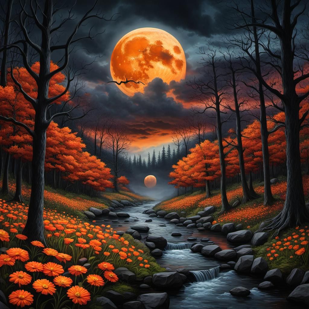 A striking picture of a gothic forest with orange flowers and a creek under a stormy twilight sky. The image is rendered in a Tim Burton-esque style with hard lighting and shadows.