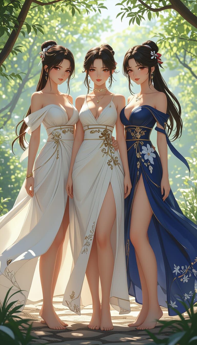 This image shows a group of women with bare feet, wearing elegant dresses and standing together in a natural setting. The image is rendered in a detailed 3D anime style.