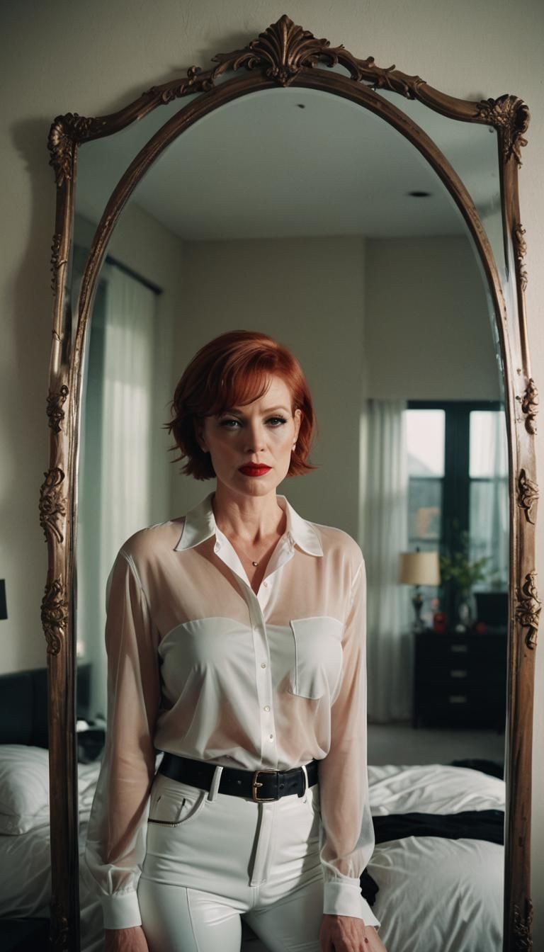 A dramatic image of a red-haired woman in a modern bedroom, reflected in a mirror. The shot features cinematic lighting, rich colors, and soft focus, in an old Hollywood style.
