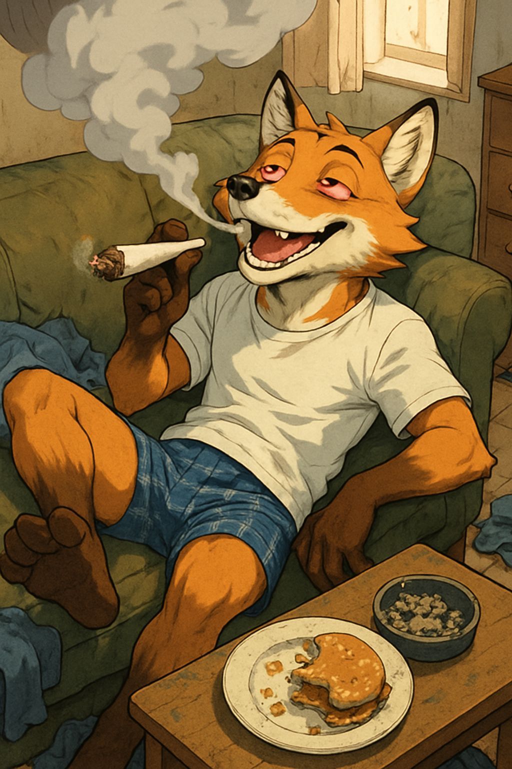 This image shows an anthropomorphic fox relaxing at home. He is wearing casual clothes, smoking a cigarette, and smiling. The scene is an anime-style illustration with sharp lines and deep colors, depicting a messy apartment.