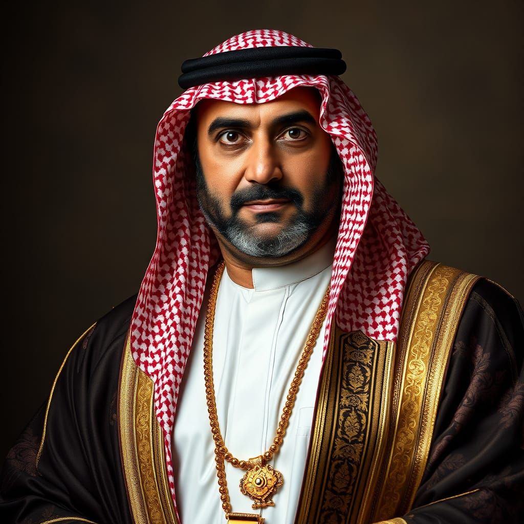 This image depicts a strong, authoritative figure in traditional Middle Eastern clothing with modern flair, adorned with opulent gold jewelry, and exuding a sense of stoicism and shrewd calculation.