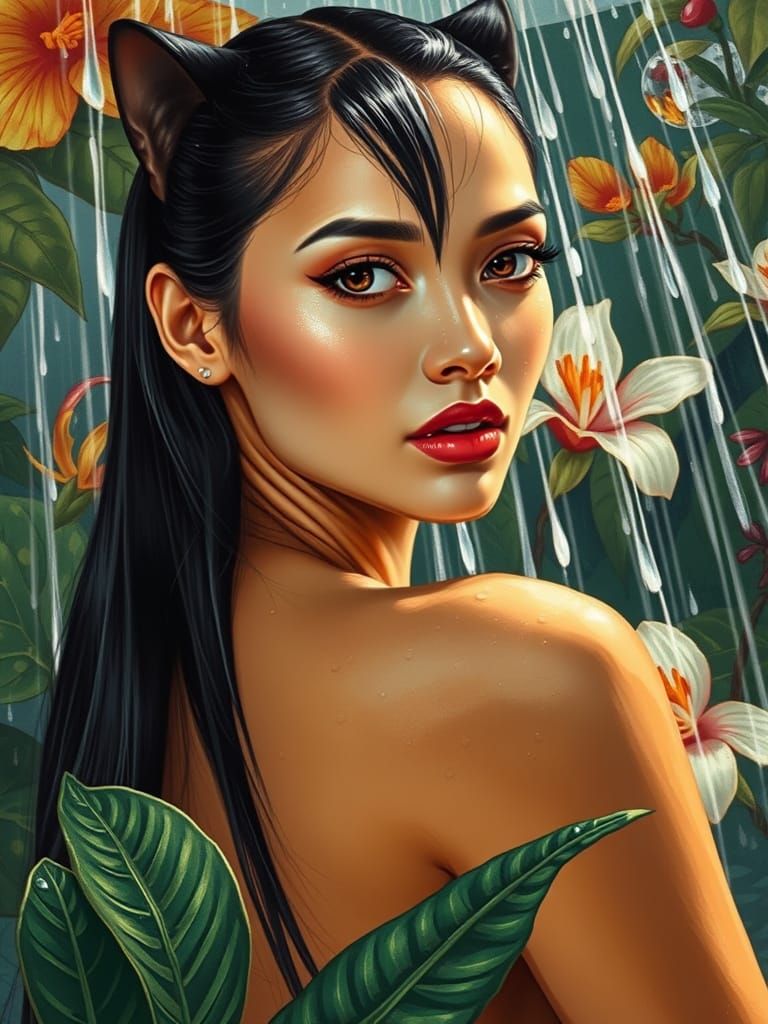 This vibrant image depicts a woman with feline features, surrounded by lush greenery and exotic flowers, in a warm shower, blending elements of Impressionist and Symbolist art styles with bold brushstrokes and vibrant colors.