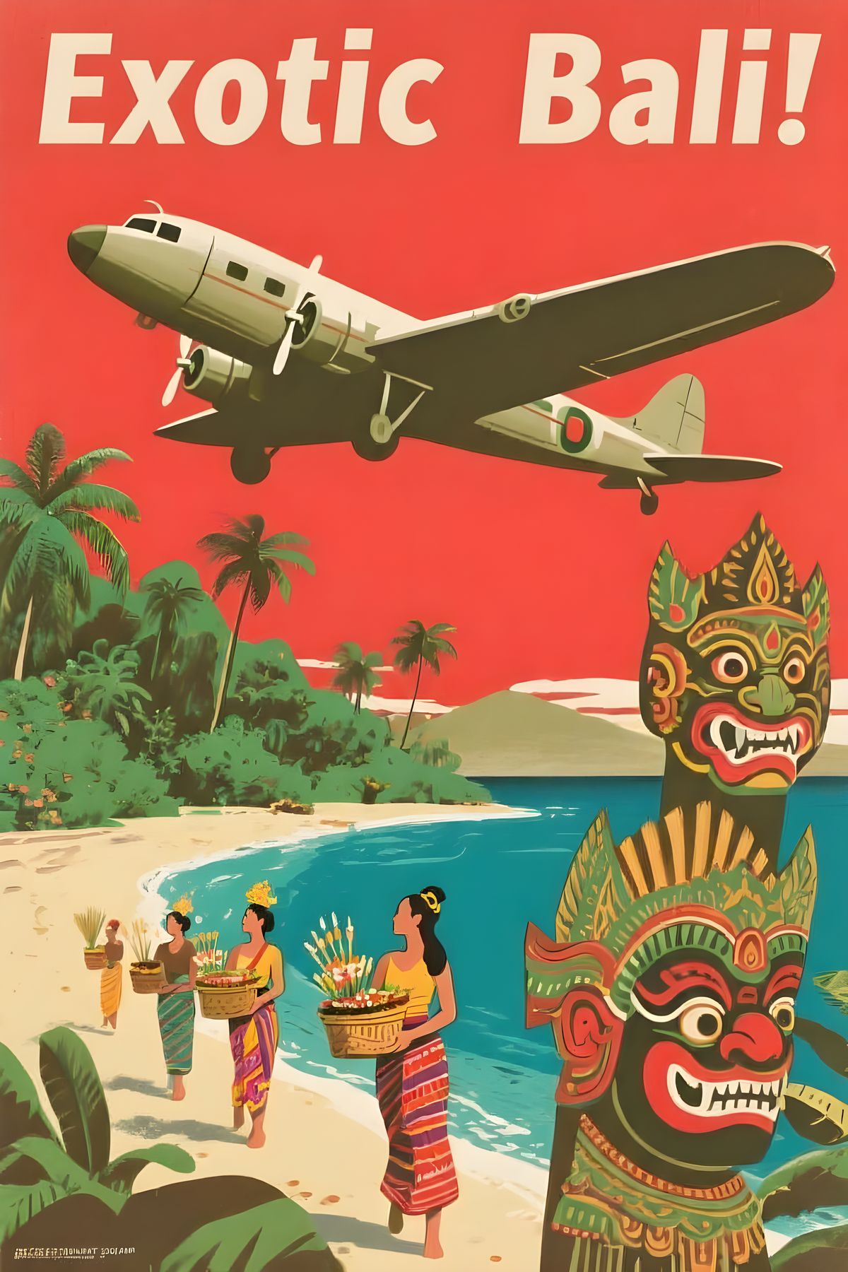 This vintage travel poster captures Bali's allure with a montage of an old plane, tropical beach, and traditional figures. Features a classic 1940s aesthetic in red, green, and blue hues.