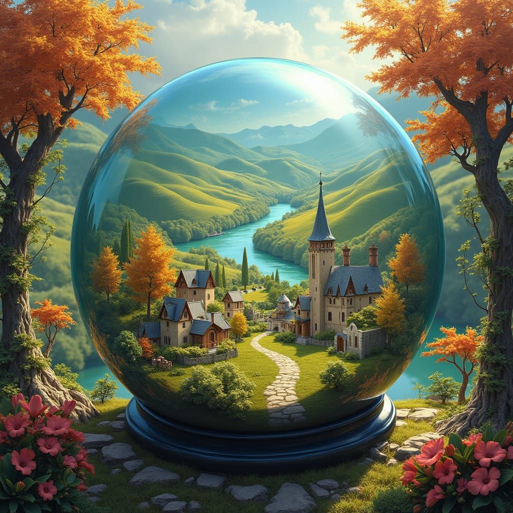 This enchanting image shows a serene village within a delicate glass crystal ball, surrounded by rolling hills, autumn forests, and farmland, with intricate details and iridescent colors that shimmer in the light, reminiscent of dreamlike fantasy worlds.