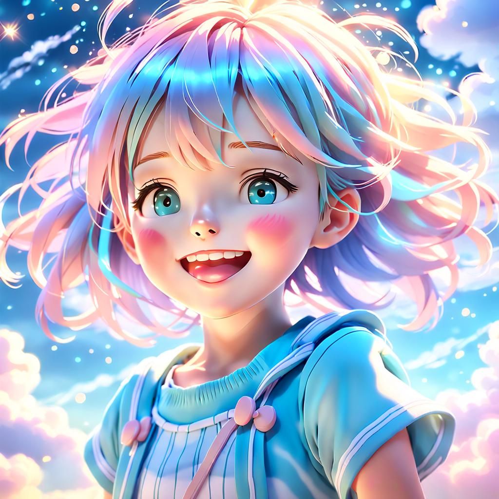 This image shows a young girl smiling serenely while playing among fluffy clouds. The portrait is rendered in a vibrant, highly-detailed 3D anime style with soft focus and pastel colors.