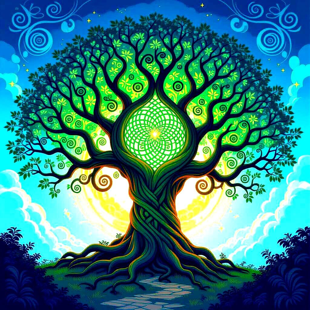 This image shows a vibrant and intricate tree of life. The artwork emphasizes the beauty and interconnectedness of nature, rendered with a touch of fantasy.
