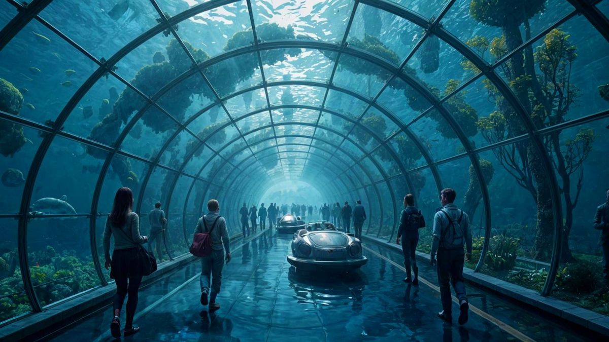 A striking picture of a futuristic underwater city. People walk through glass corridors, observing small submarines used for public transport. The scene is rendered with cinematic photorealism and intricate digital detail.