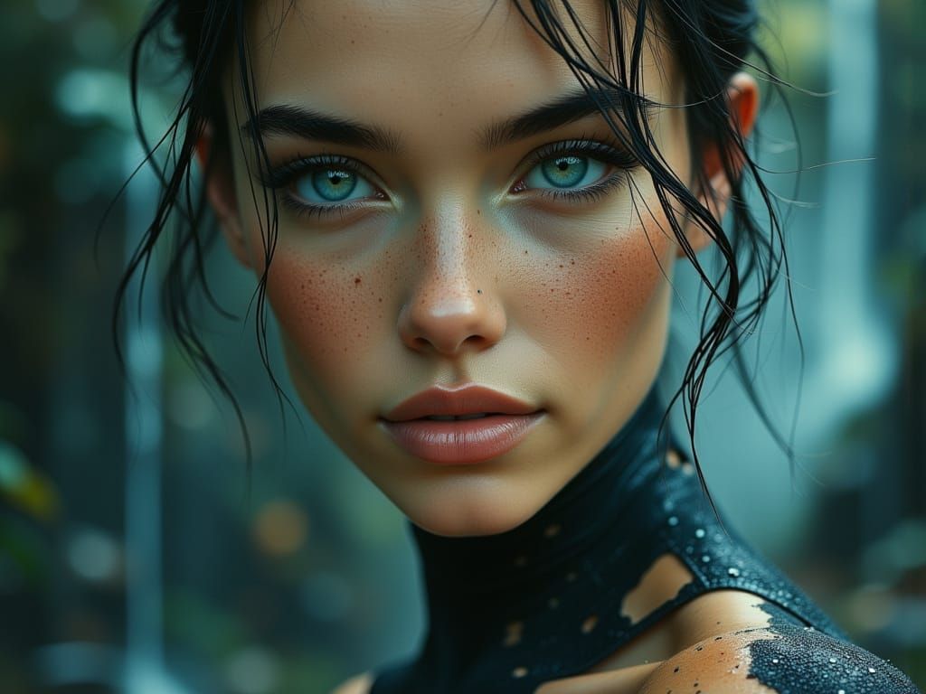 This image shows a Hawaiian female runner in a tight spandex suit, with steel-blue eyes, set against a lush waterfall backdrop. It features detailed skin, intricate textures, and bright, high-contrast colors.