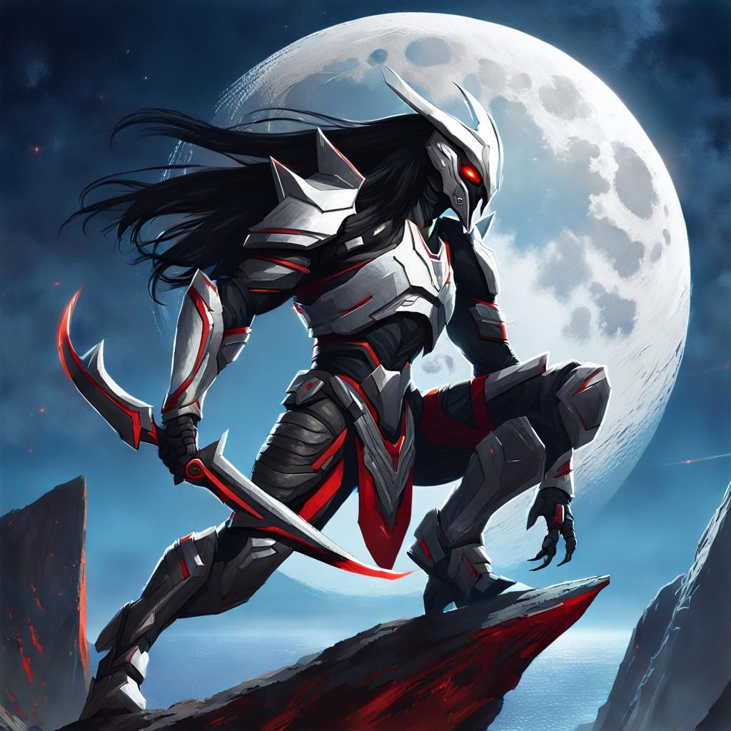 This image shows a muscular, taupe-skinned, humanoid monster deity poised for battle on a cliff under a full moon. The digital illustration features Warframe and Phyrexian art styles, with silver armor and red accents.