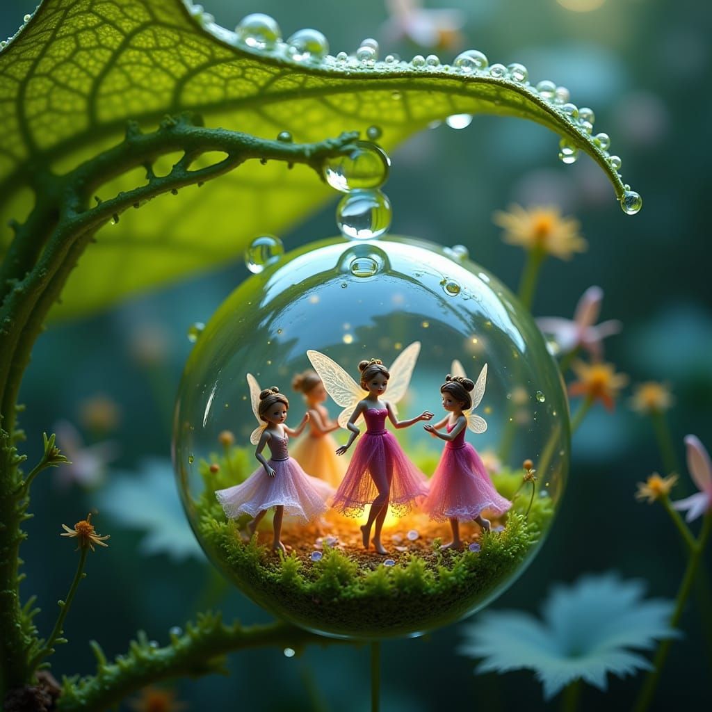 A captivating image showcasing a miniature world nestled within a dewdrop on a leaf, where joyful fairies host a grand ball, reminiscent of whimsical illustrations. This scene is depicted with hyperrealistic splash art.