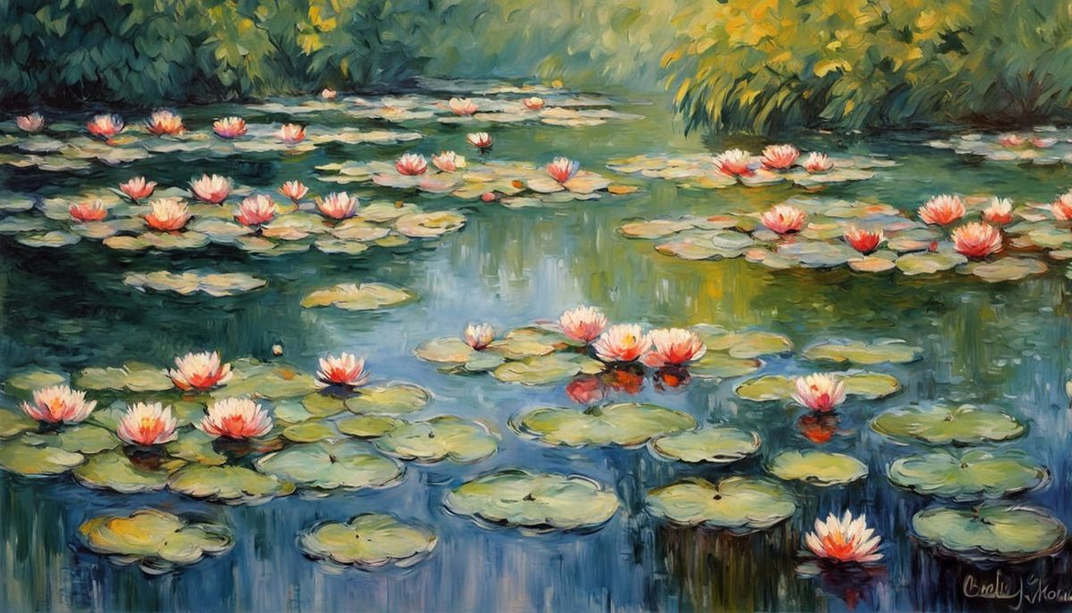 This image shows delicate, shimmering flowers in a lush, natural setting, bathed in warm sunlight and captured in vivid, impressionist brushstrokes with a soft, pastel color palette and pops of bright coral and turquoise.