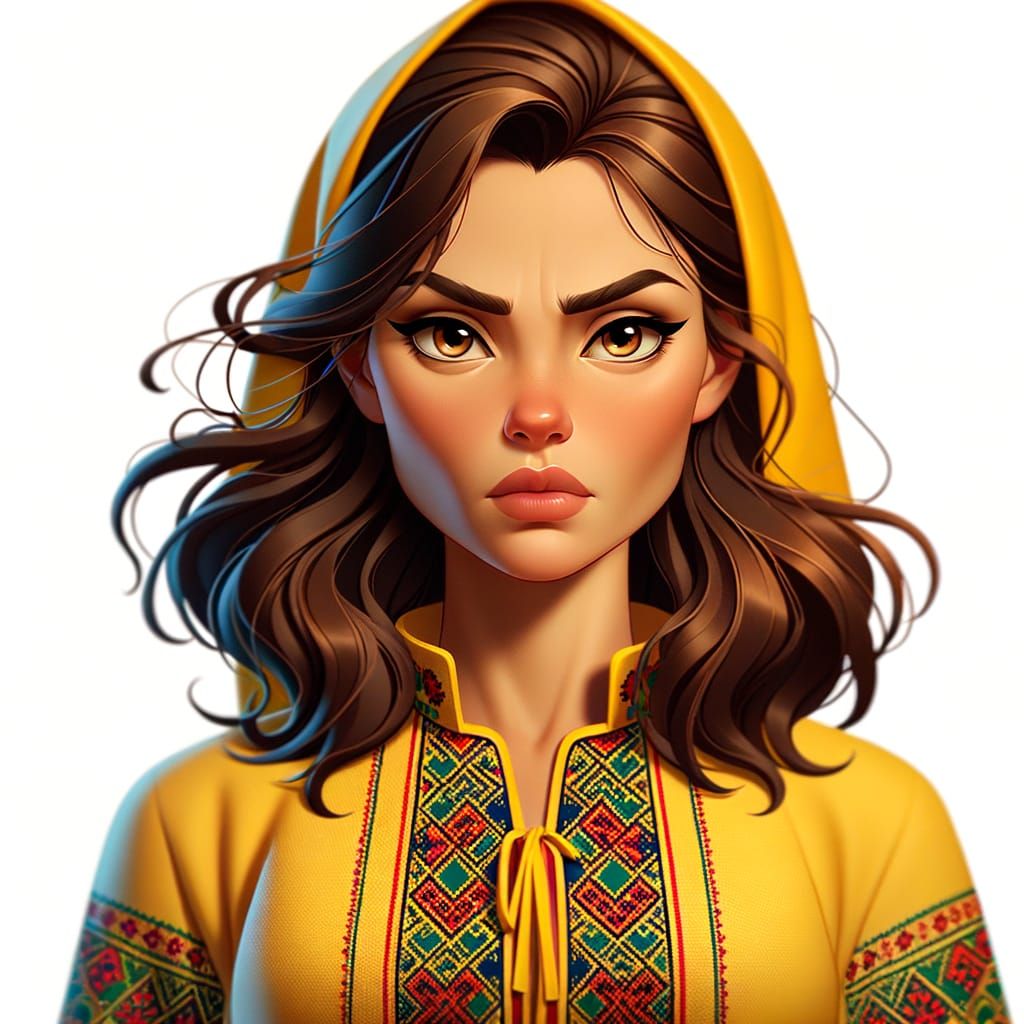 This image depicts a determined Ukrainian woman wearing a vibrant yellow vyshyvanka, intricately embroidered with traditional Ukrainian patterns, showcasing her heritage and strength.
