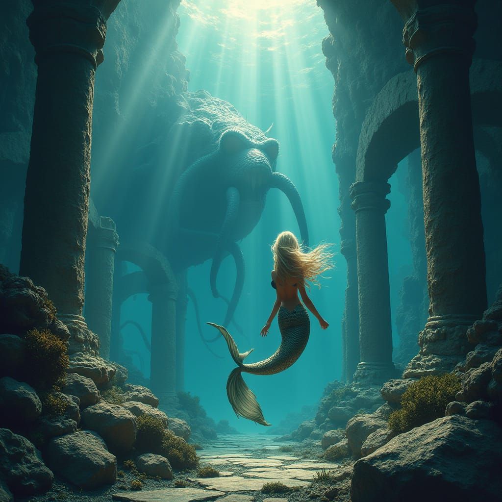 This fantasy art illustration depicts a graceful mermaid swimming through ancient Atlantean ruins. Dramatic lighting illuminates coral-encrusted columns and arches, with a sea monster lurking in the background. Hyperrealistic and vibrant.