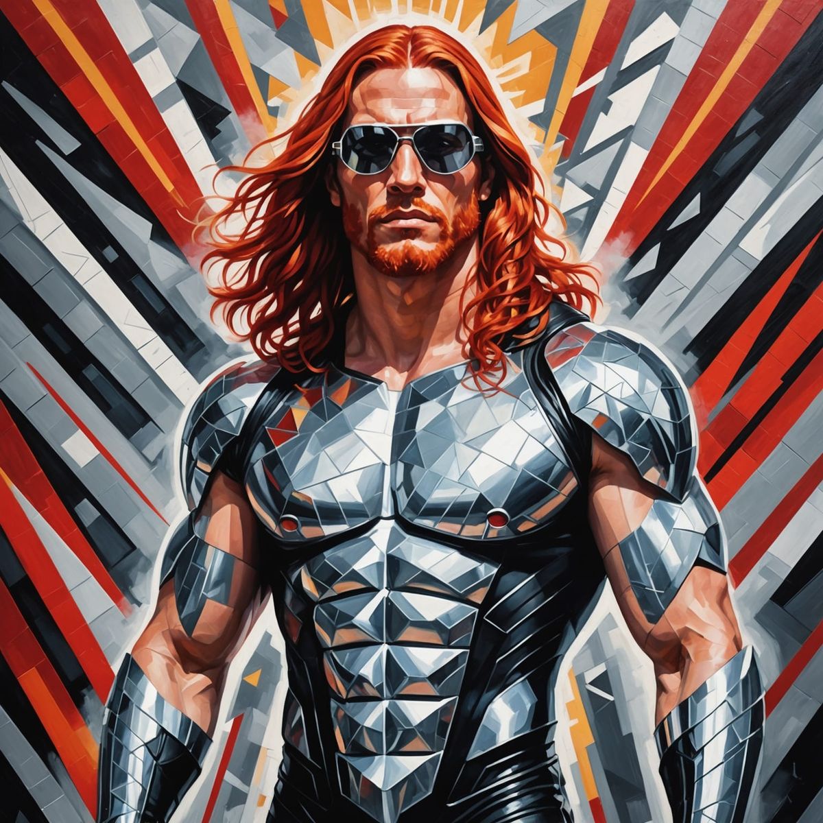 This vibrant painting depicts a male wrestler with long red hair and tattoos, set against a backdrop of heavenly sunshine. The artwork blends elements of Neo-Cubism, Art Deco, and Geometric Fauvism, with a focus on layered, overlapping geometry and bold, textured colors.