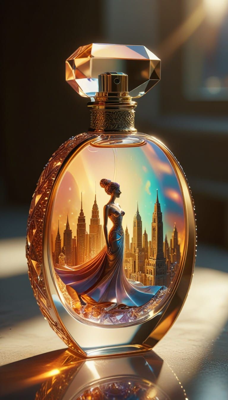 This image shows a macro photograph of a textured perfume bottle with gold and iridescent details. Sunlight shines through the bottle, revealing a complex sculpture with optical illusions, rendered in photorealistic detail.