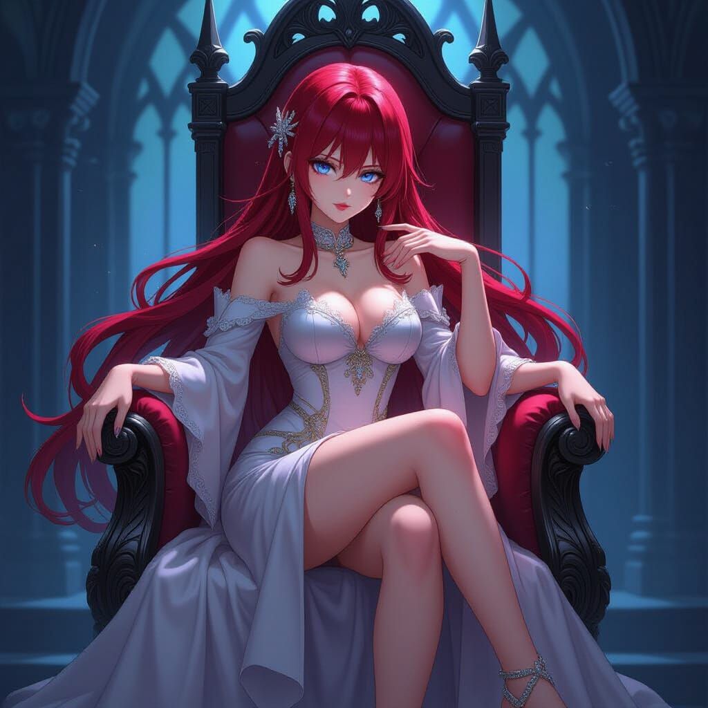 This image shows an anime-style woman with crimson hair and blue eyes sitting on a throne. She is wearing a form-fitting fantasy dress in a dimly lit gothic hall as digital art.