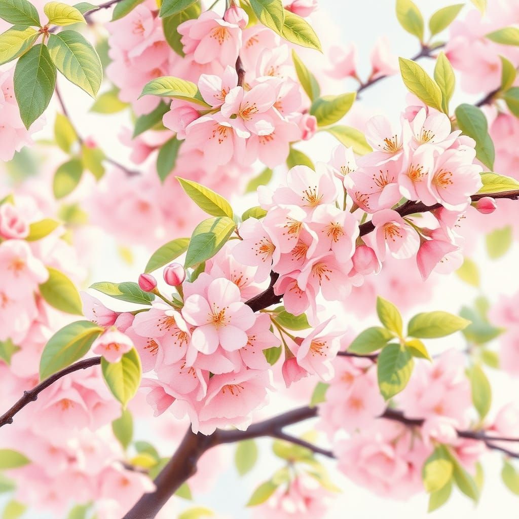 A watercolor painting of a cherry tree blossoming in summer. Soft pink petals and lush green leaves create a dreamy, whimsical scene with delicate brushstrokes.