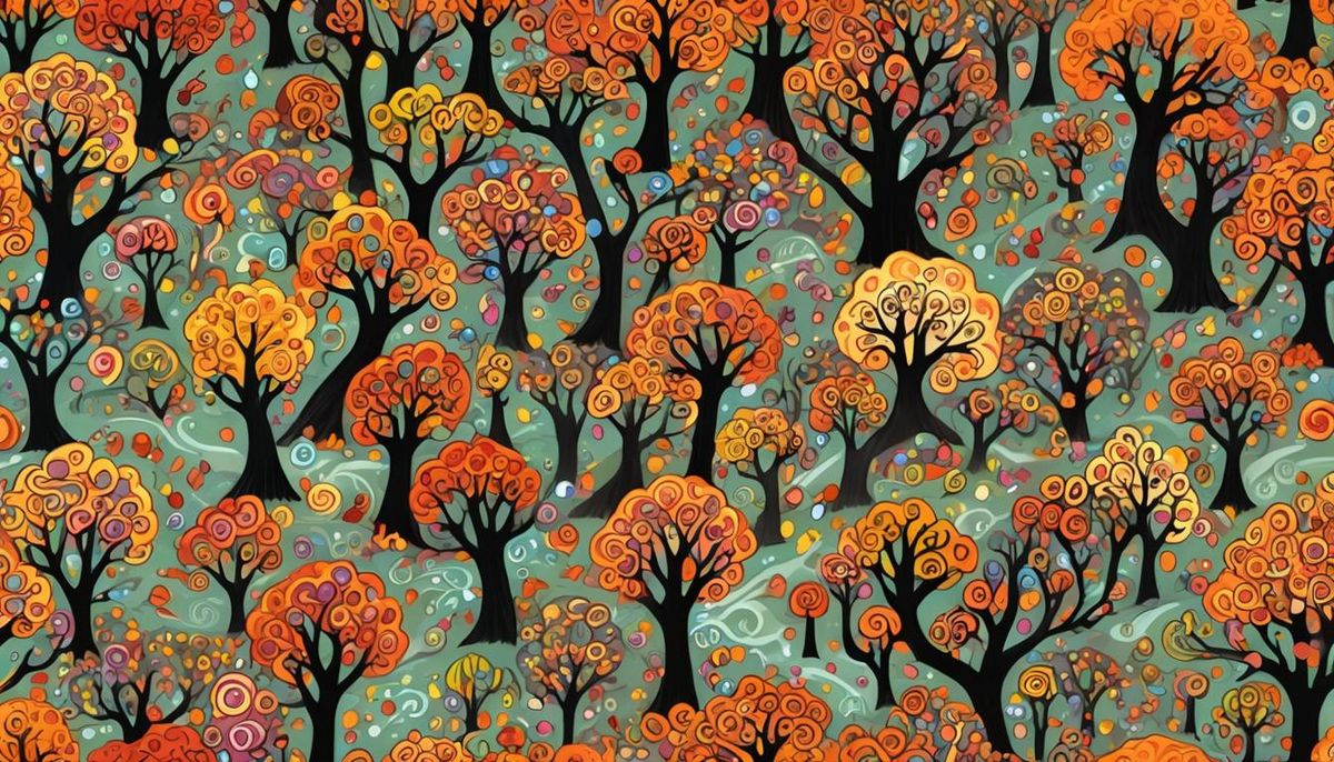 A vibrant image of a spooky autumn candyland. This picture shows a caramel tree in a swirling gouache style, creating a detailed and colorful wonderland.