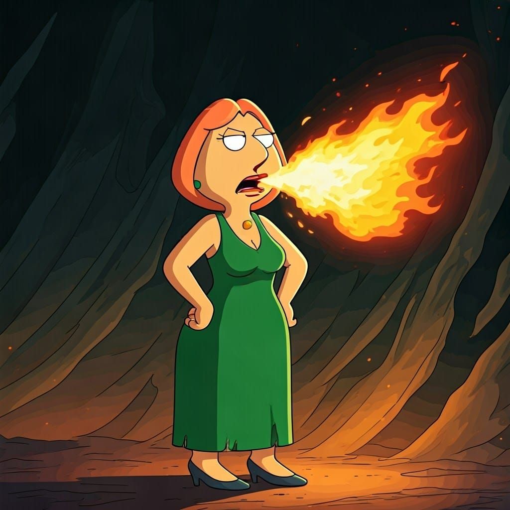 This image shows a fiery, cartoon-style Lois Griffin, dressed in a flowing green dress, breathing fire with a furious expression, set against a dark, smoky backdrop with bold lines and vibrant colors.