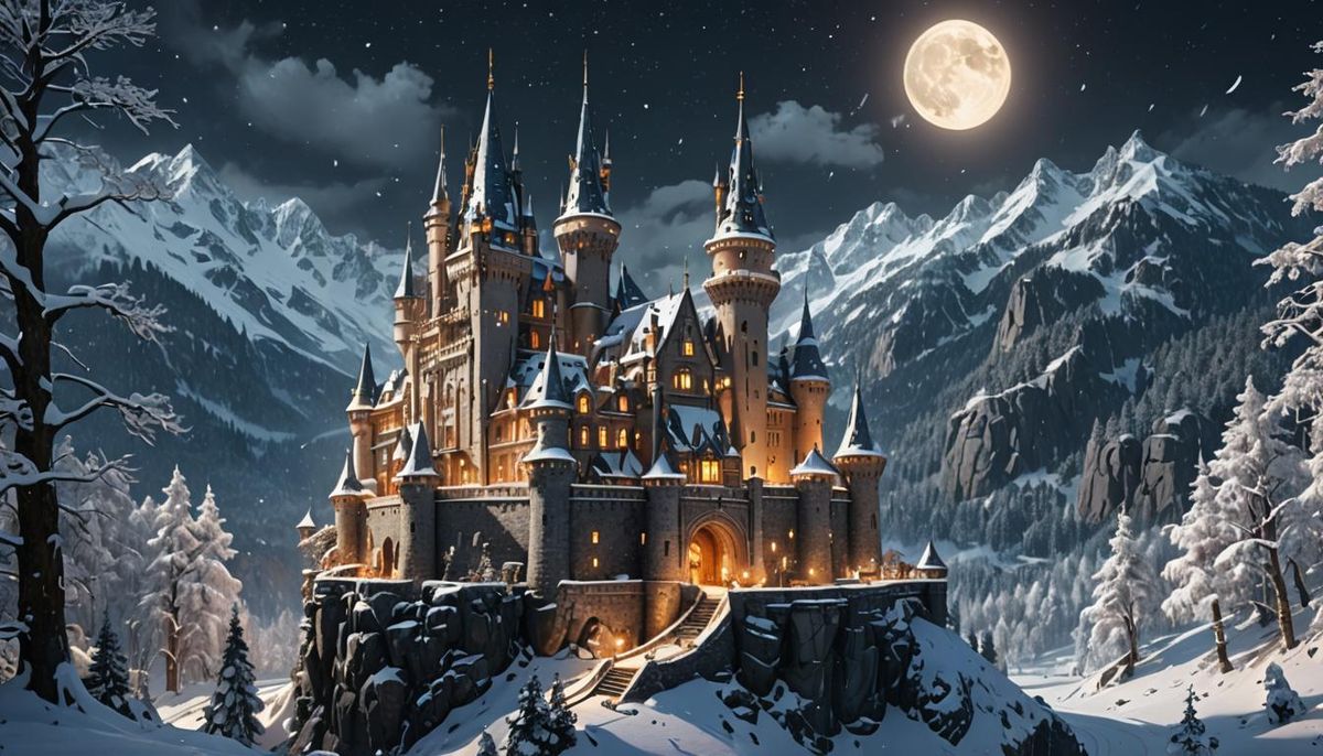This image shows a grand castle nestled in a snow-covered forest. The scene is illuminated by moonlight, with sparkling icicles and twinkling lights creating an ethereal atmosphere. The 3D rendering features a pastel color palette.