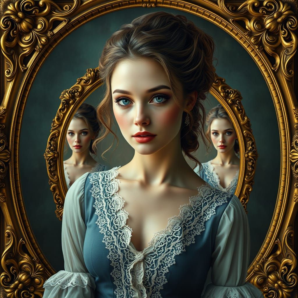 This image shows a stunning, infinitely recursive portrait of a beautiful woman in a Victorian-inspired dress, surrounded by ornate golden frames, showcasing incredible attention to detail and photorealistic style.