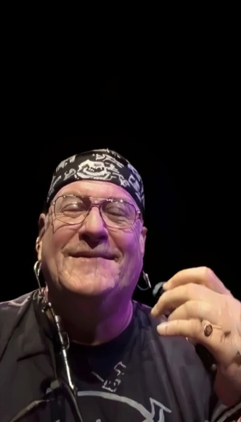 This image depicts a heavy-set, middle-aged rock singer performing in a garish amusement park tent. The cartoon caricature style features bold lines, bright colors, and exaggerated proportions.
