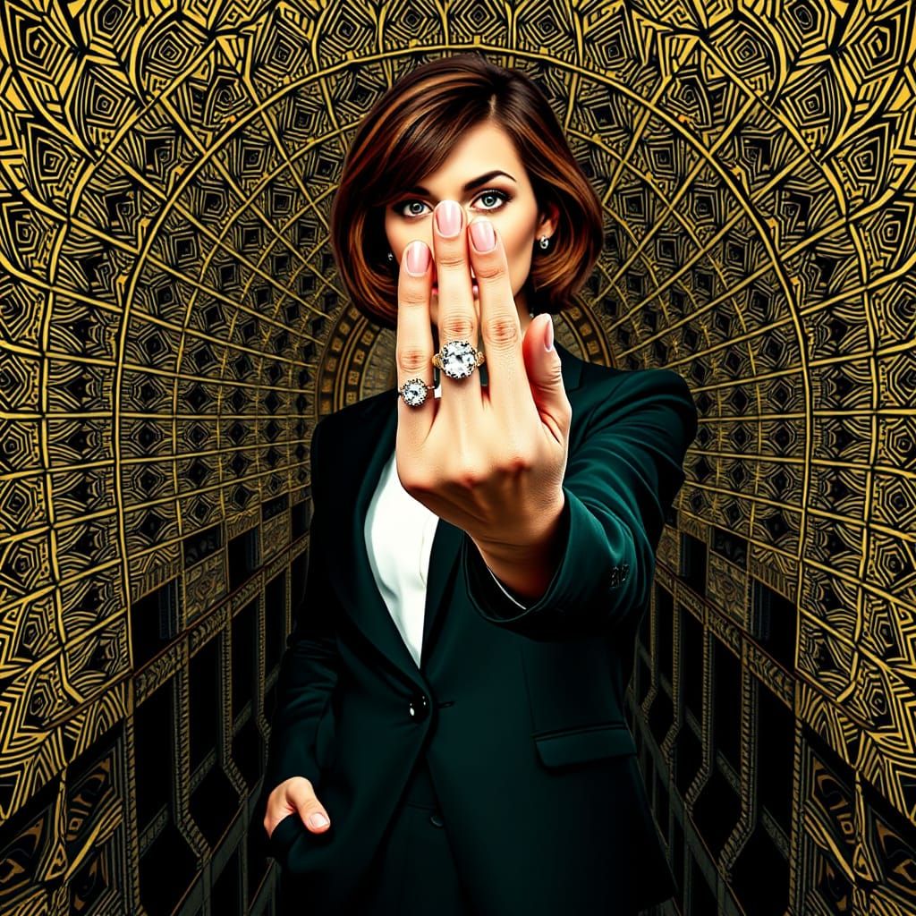 An intricate image of Miranda Kerr in a business suit, her hand adorned with a diamond ring, set against a geometric, golden ratio-inspired backdrop with detailed shading.