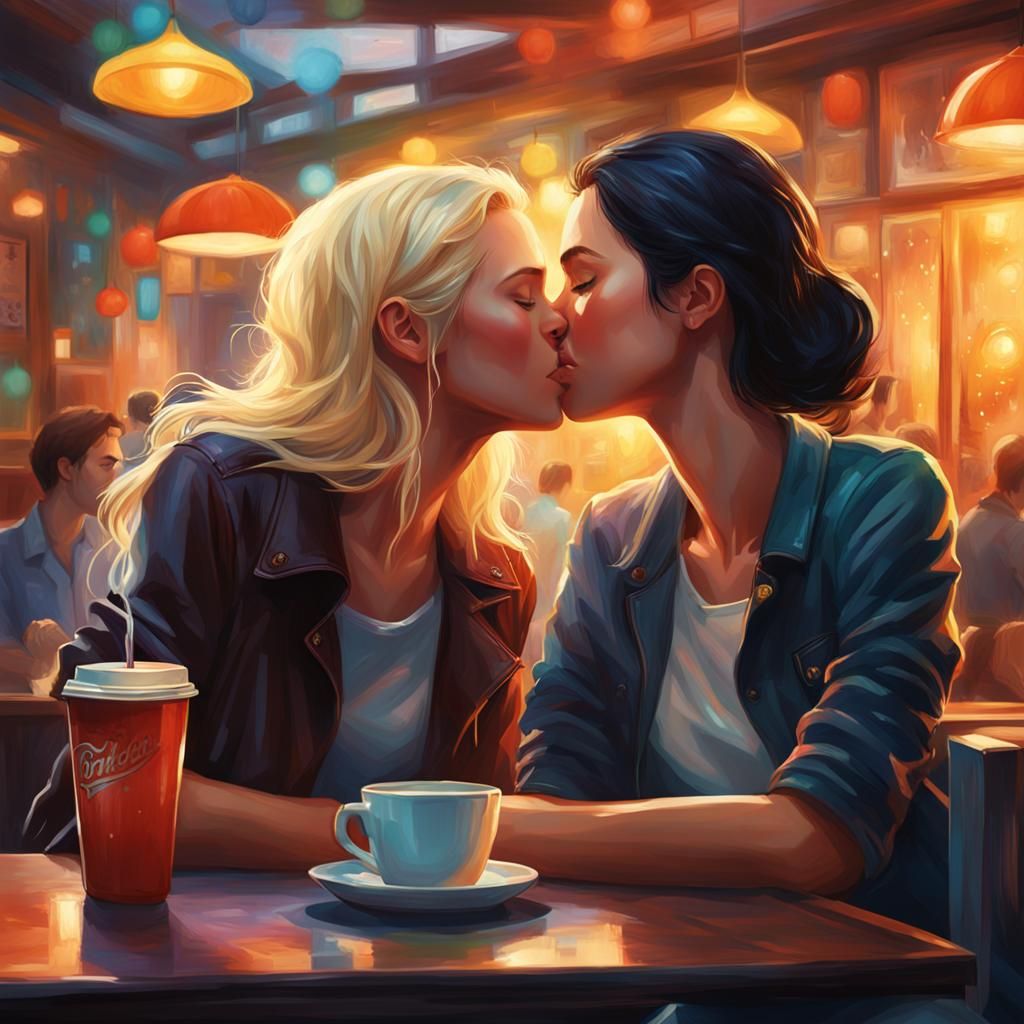This image shows two young women kissing in a cafe. The hyperrealistic digital art features intricate details, a vibrant color palette, and dramatic side lighting in a mid shot.
