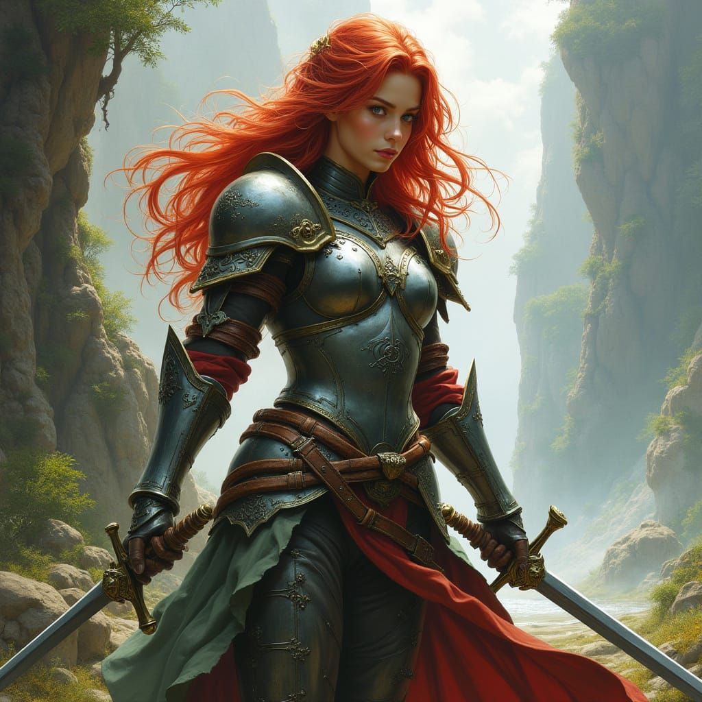 This image shows a red-haired female elf paladin in full body armor, wielding swords. The fantasy landscape is rendered with intricate details and a mystical atmosphere, in a fantasy art style.