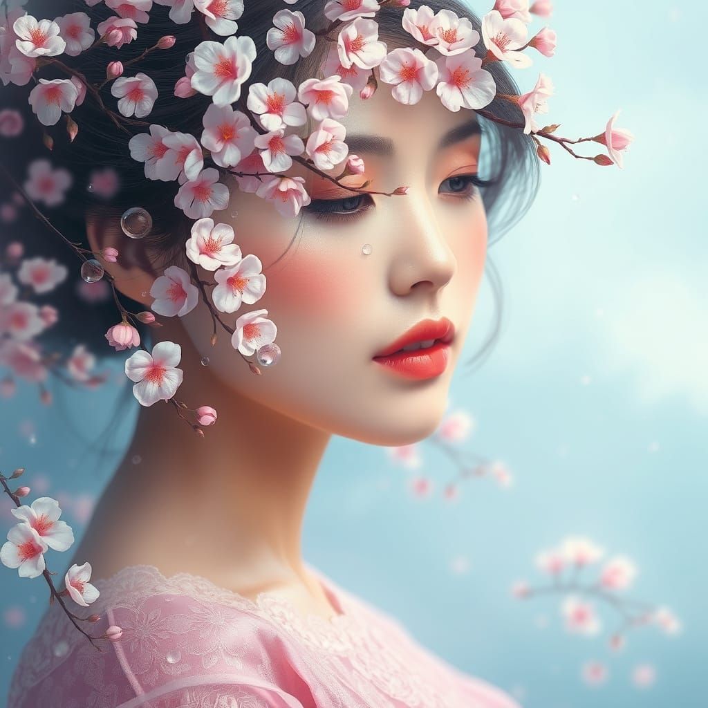 This image shows a serene woman subtly blended with cherry blossoms and water droplets. The artwork employs soft focus and a vibrant color palette in an ethereal fantasy style.