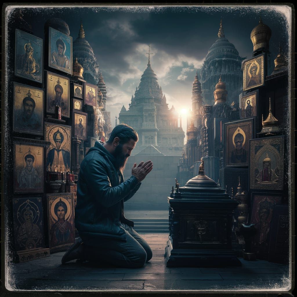 This image shows a man kneeling in prayer before a grand structure. Religious symbols surround him, bathed in the warm light of the setting sun, captured with cinematic techniques and film-like quality.